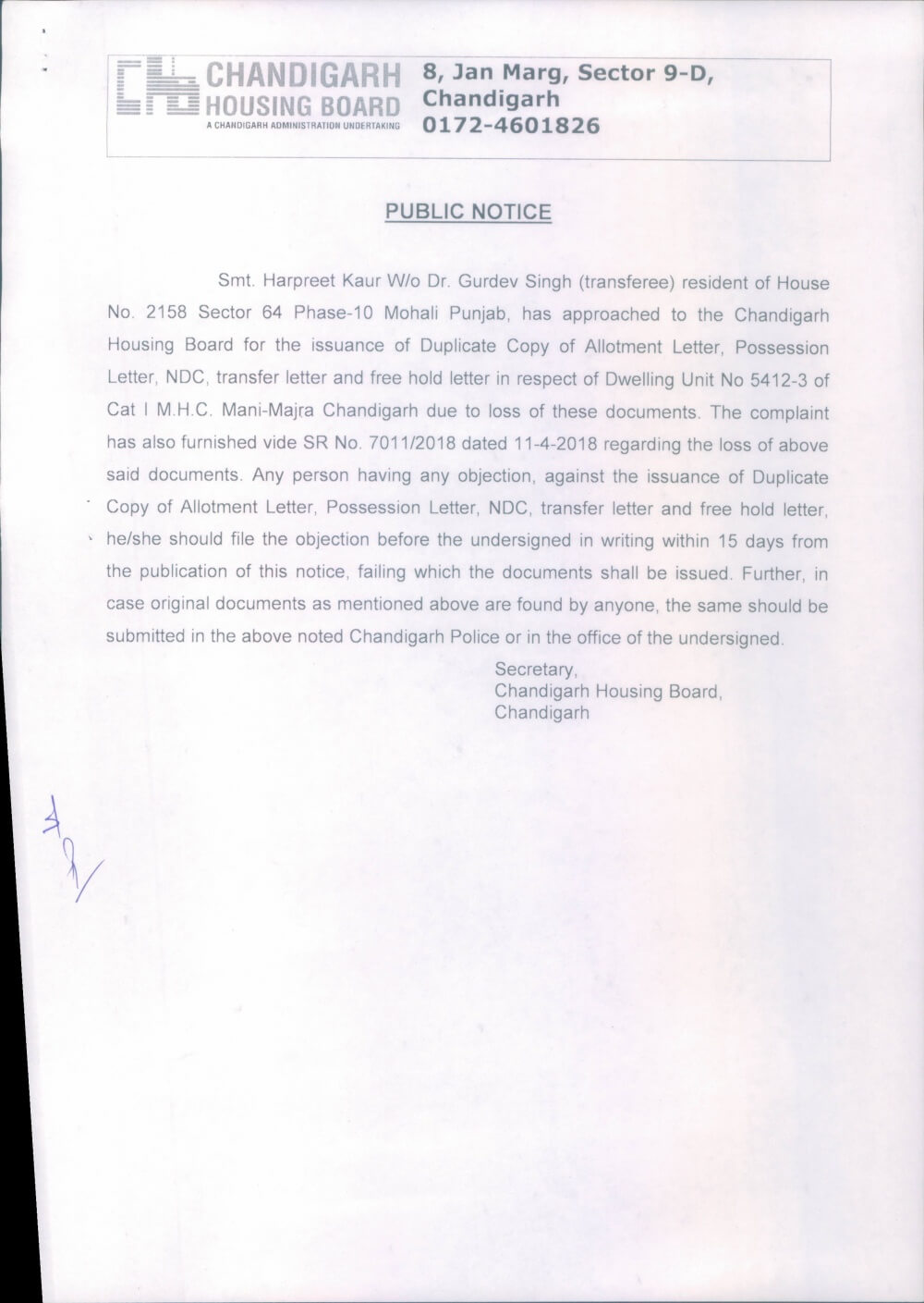 Transfer/Mutation of Registration & allotment rights on intestate demise basis. D.U.No. 1107,S/29B, Chd.July 13, 2018Office Order No.135 dated 12.07.2018 regarding 411th Board meetingJuly 13, 2018 Show all Duplicate copy of transfer letter in r/o D.U.No. 5412-3, Manimajra, Chd. Chbonline Related postsPublications dt.05.03.2026Read more Comments are closed.