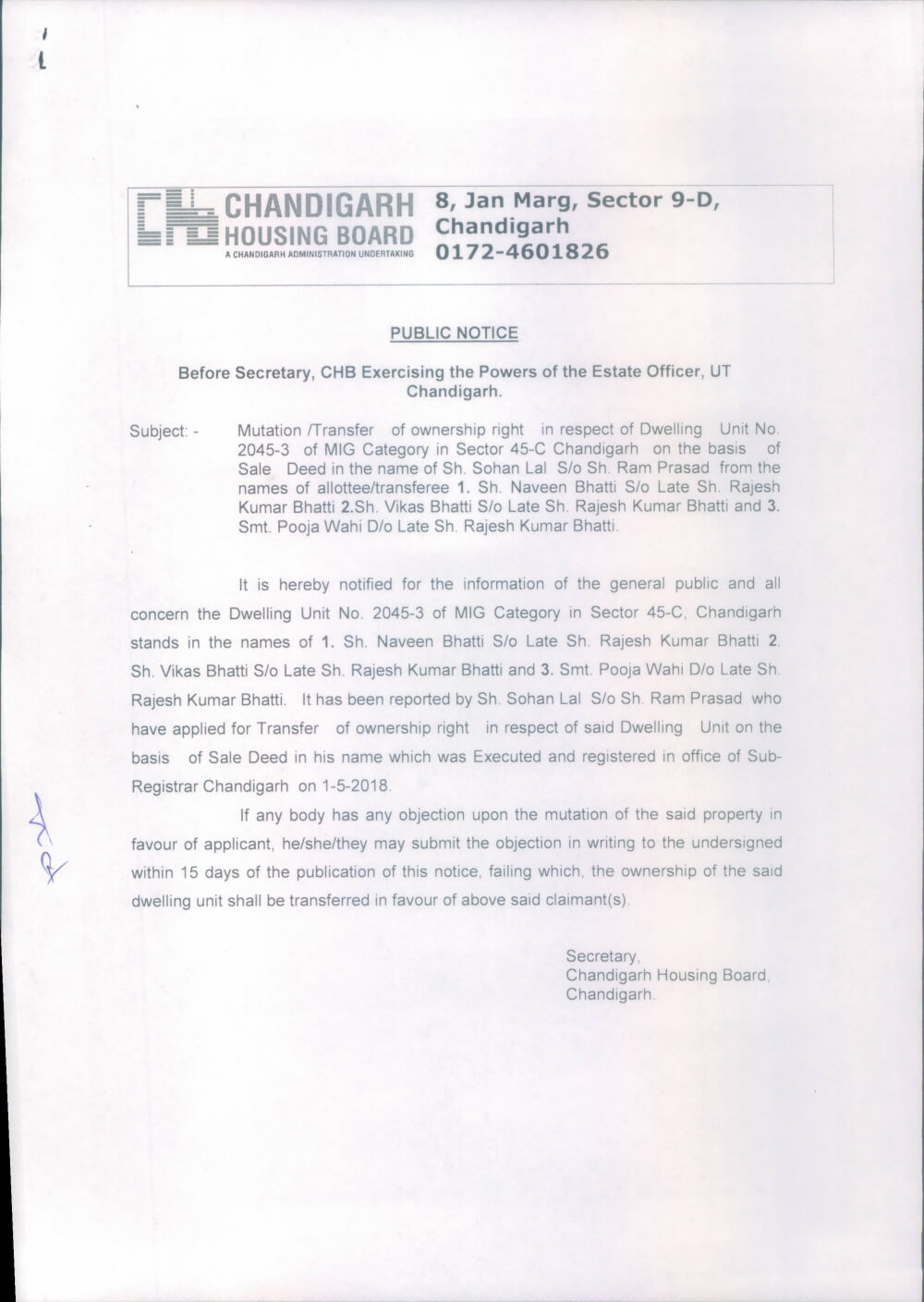 July 17, 2018Mutation/Transfer of ownership right in r/o D.U.No. 2045-3,S/45C, Chd. on the basis of sale deed.