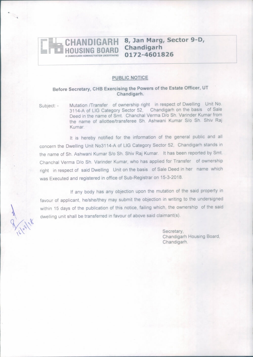 July 6, 2018Mutation/Transfer of ownership right in r/o D.U. No. 3114-A, S/52, Chd. on the basis of sale deed.