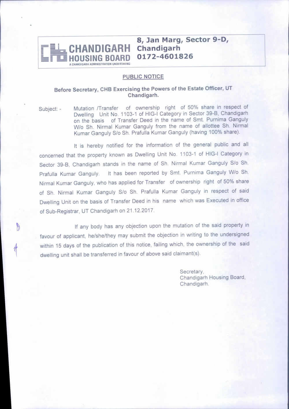 Mutation/Transfer of ownership right in r/o D.U.No. 3064,Sec-52, Chd. on the basis of sale deed.February 8, 2018Streamline the process of permission to mortgage vide Office Order No.1236 dt.08.02.2018February 8, 2018 Show all Mutation/Transfer of ownership right of 50% sahre in r/o 1103-1,Sec-39-B, Chd. Chbonline Related postsPublications dt.05.03.2026Read more Comments are closed.