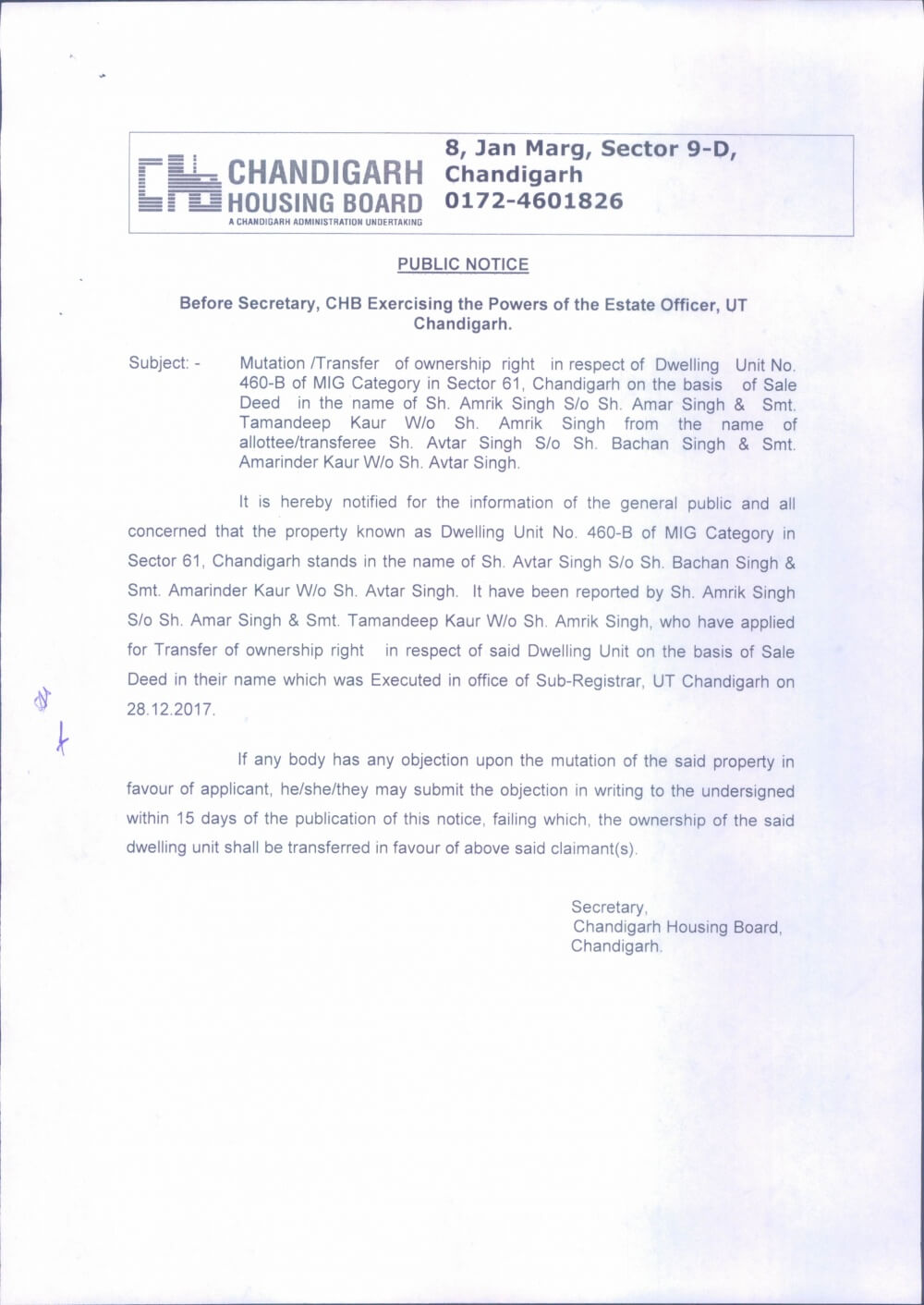Mutation/Transfer of ownership right in r/o D.U.No. 3325-1, MIG, Sec-45-D, Chd. on the basis of Sale Deed.February 6, 2018Mutation/Transfer of ownership right in r/o D.U.No. 3129-3, Sec-44-D, Chd. on the basis of sale deed.February 6, 2018 Show all Mutation/Transfer of ownership right in r/o D.U.No. 460-B,Sec-61, Chd. on the basis of sale deed. Chbonline Related postsPublications dt.05.03.2026Read more Comments are closed.