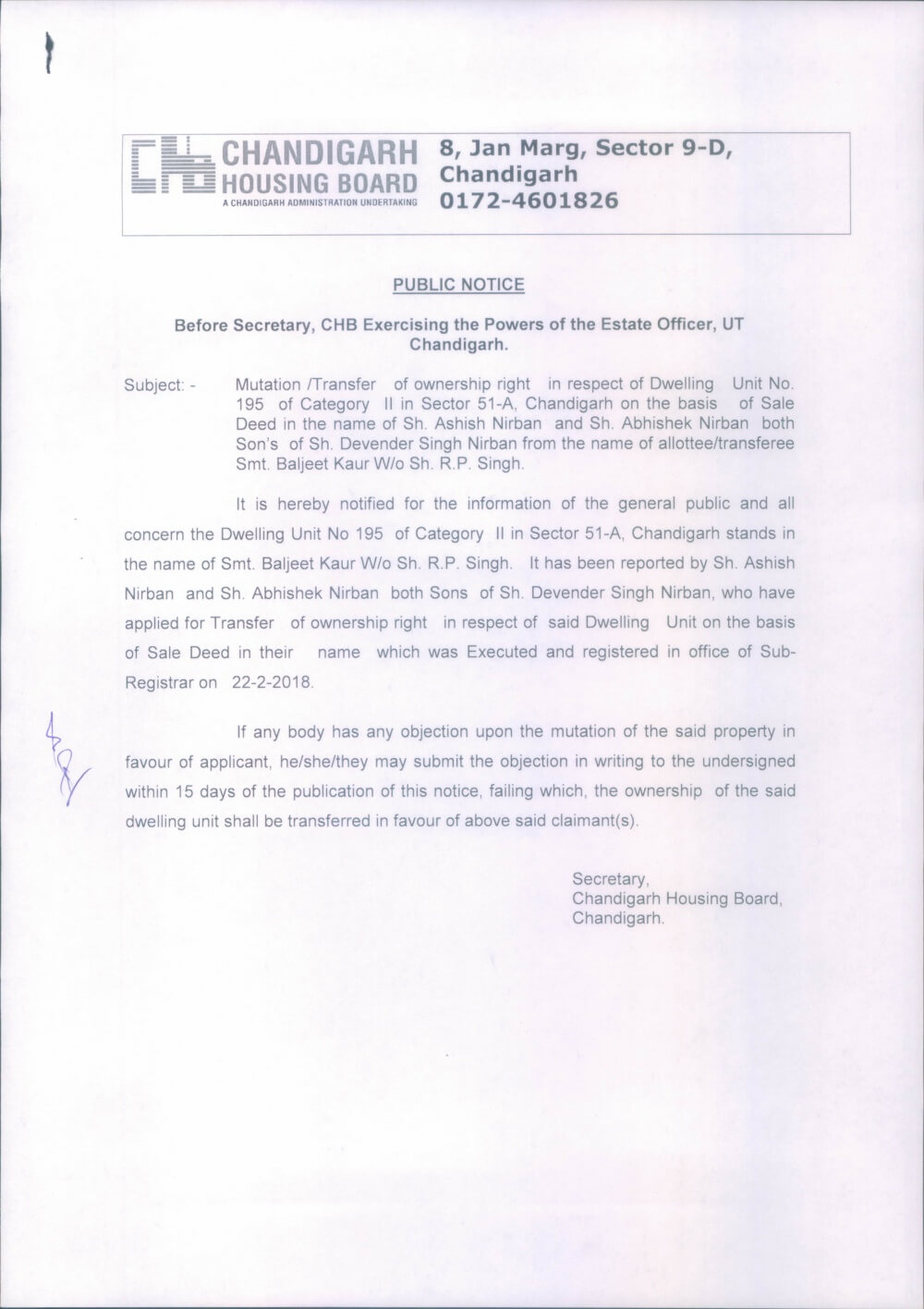 July 12, 2018Mutation?transfer of ownership right in r/o D.U. NO. 195,S/51A, Chd. on the basis of sale deed.