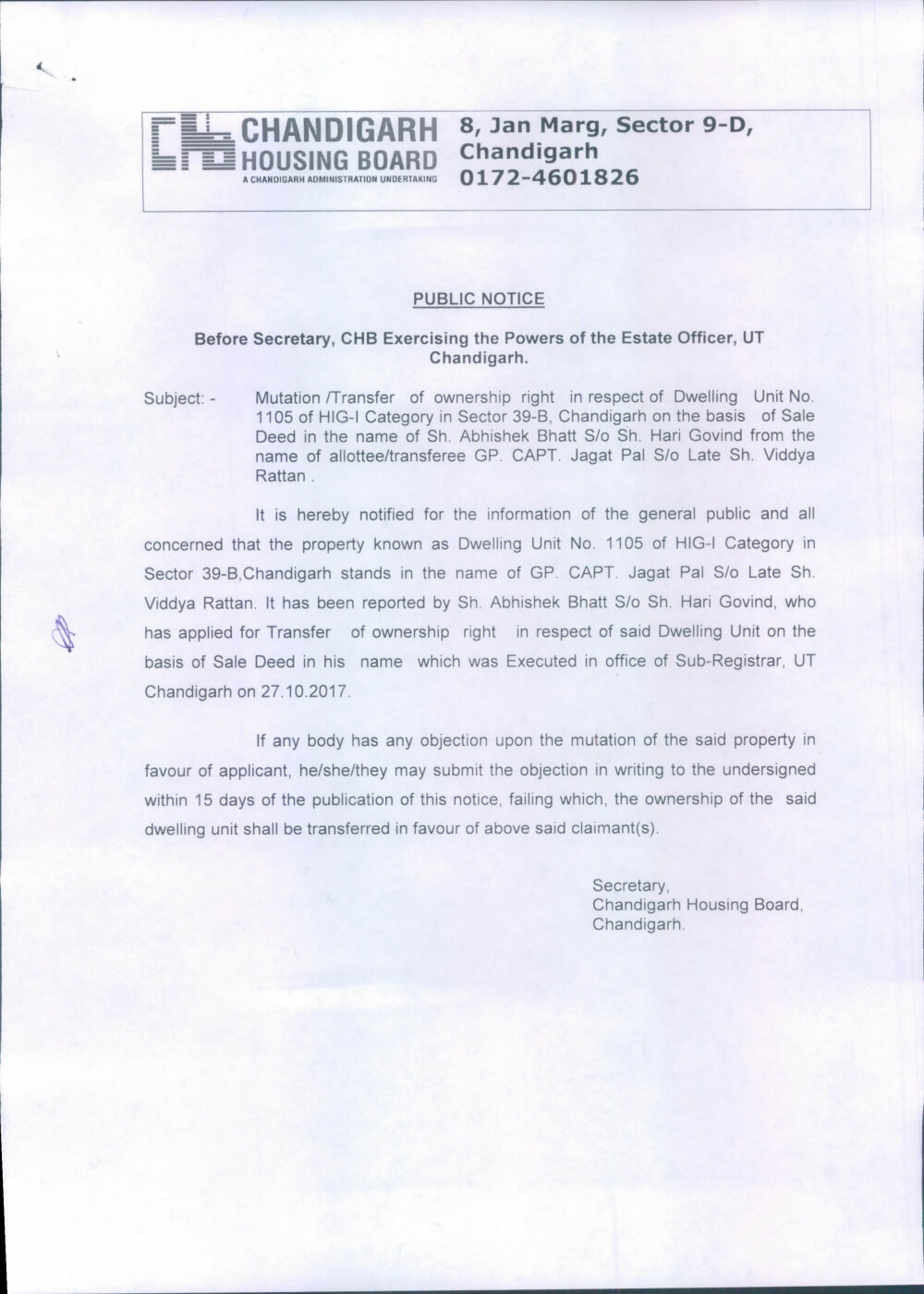Mutation/Transfer of ownership right in r/o D.U.No.2024, S/47C, Chd. on the basis of sale Deed.November 27, 2017Mutation/Transfer of ownership right in r/o D.U.No. 4838-A,EWS S/38(W), Chd. on the basis of sale deed.November 27, 2017 Show all Mutation/Transfer of ownership right in r/o D.U.No. 1105,HIG-I,S/39B, Chd. on the basis of sale deed. Chbonline Related postsPublications dt.05.03.2026Read more Comments are closed.