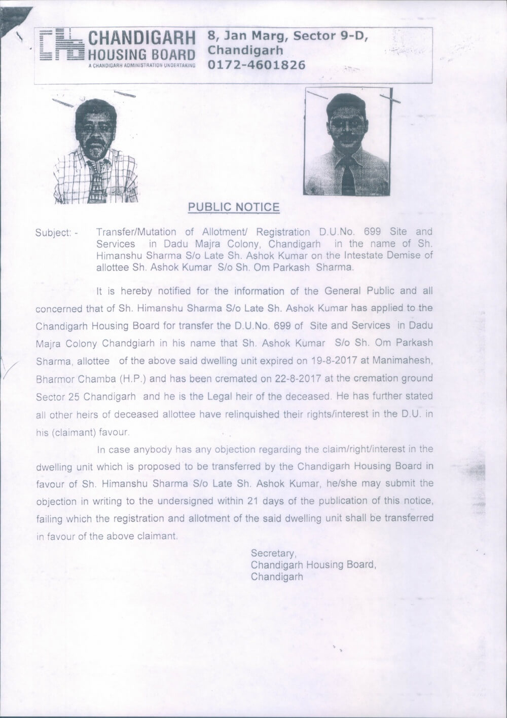 July 11, 2018Transfer/Mutation of Registration & allotment rights on intestate demise basis. D.U.No. 699, DMC, Chd.