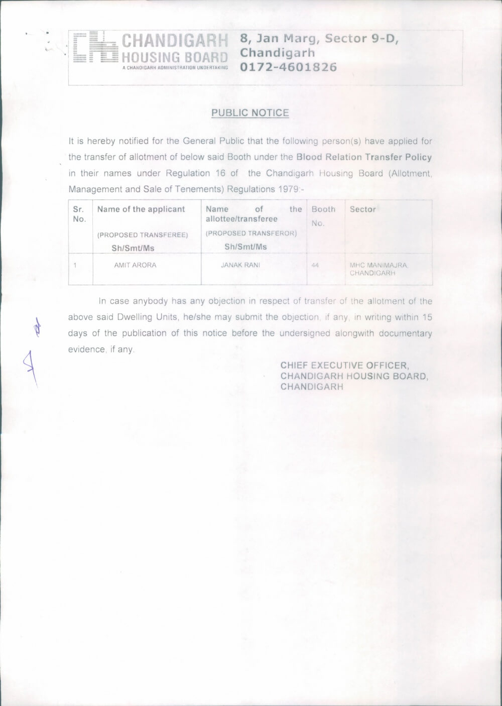 Mutation/Transfer of ownership right in r/o D.U.No. 360-2,S/41-A, Chd. on the basis of sale deed.July 9, 2018Duplicate copy of Allotment letter and possession letter in r/o D.U.No. 3235-3 in S/44D, Chd.July 9, 2018 Show all Transfer of Booth No. 44, Manimajra on the basis of Blood Relation Transfer Policy. Chbonline Related postsDuplicate document of #432-1, Sec.45-A, Chd. dt.23.04.2026Read more Comments are closed.
