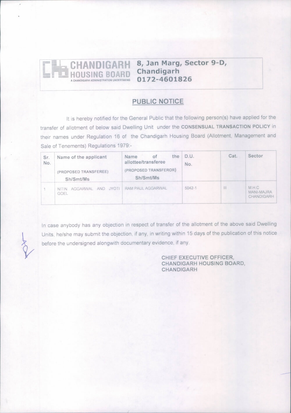 Transfer of D.U.No. 3227,S/45D, Chd. on the basis of Consensual Transaction Policy.July 16, 2018Transfer of D.U.No. 2297-C,S/63, Chd. on the basis of Consensual Transaction Policy.July 16, 2018 Show all Transfer of D.U.No. 5042-1,Manimajra on the basis of Consensual Transaction Policy. Chbonline Related postsDuplicate document of #1439, Sec.61, Chd. dt.05.02.2025Read more Comments are closed.