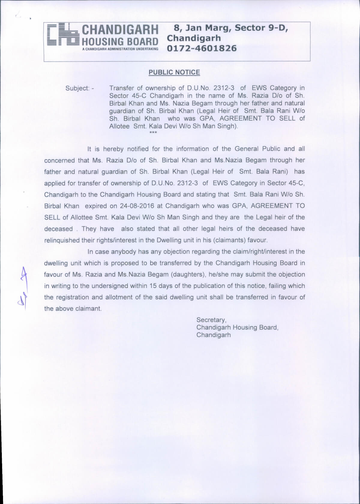 December 19, 2016Transfer/Mutation of allotment/registration on mutation basis(on the intestate demise of allottee)D.U.No.1182-1,Sec-40B,Chd. Dt. 19/12/16
