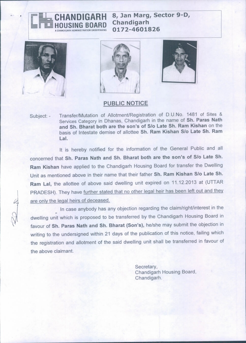 Transfer/Mutation of D.U.No. 3261-1,EWS S/47-D, Chd.October 4, 2017Transfer of D.U.No. 3221-1,S/44-D, Chd.on the basis of Consensual Transaction Policy.October 11, 2017 Show all Transfer/mutation of allotment/registration on mutation basis (on the intestate demise of allottee) D.U.No. 1481,Dhanas. Chbonline Related postsPublications dt.05.03.2026Read more Comments are closed.