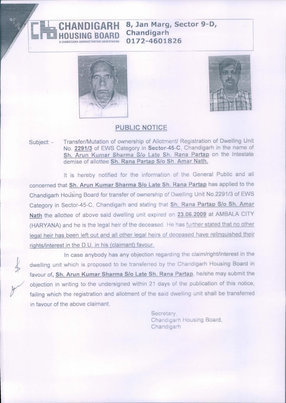 September 9, 2016Transfer/Mutation of ownership of Allotment/registration on the intestate demise of allotee. Booth No 107 Maloya Colony