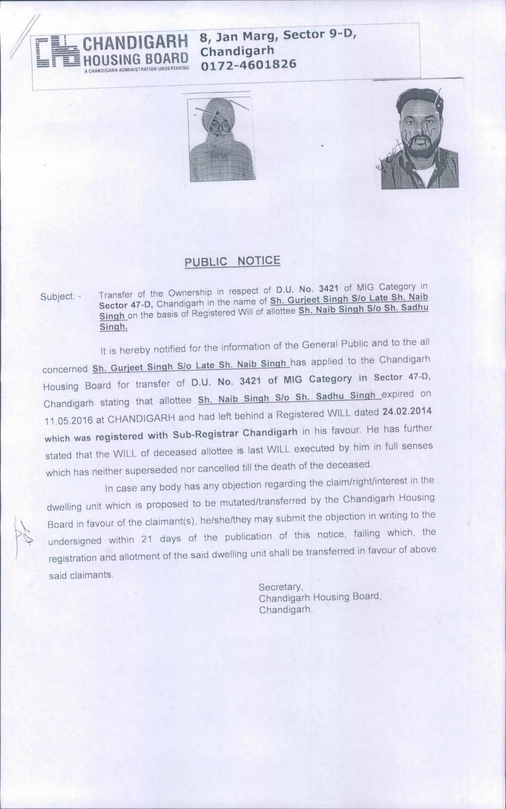 April 7, 2017Transfer/Mutation of allotment/registration on mutation basis (on the intestate demise of allottee) D.U.No. 2921-1, dt. 31/3/17